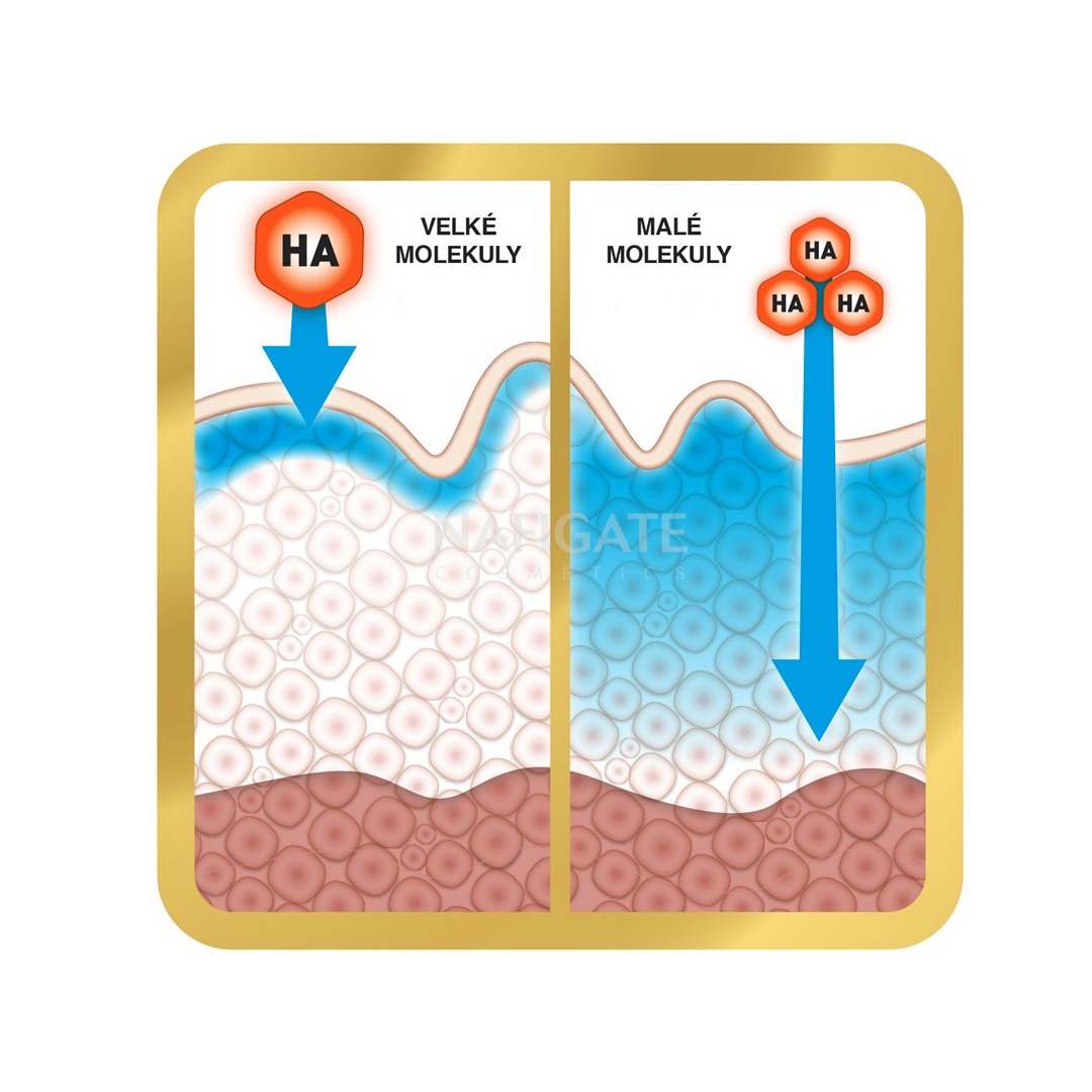 MALÉ MOLEKULY – Mini HA™ má velikost molekul 3000 – 10000 daltonů. Díky své nízkomolekulové hmotnosti proniká do hloubky pokožky, kde napravuje a oddaluje vznik vrásek a jizev tím, že stimuluje obnovu a růst buněk. Účinek je při pravidelném používání dlouhodobý. VELKÉ MOLEKULY – Klasická HA má velikost molekul 1-2 mil. daltonů a díky své vysokomolekulové hmotnosti působí na povrchu pokožky, kde ji regeneruje a vyhlazuje. Účinek je viditelný a citelný.
